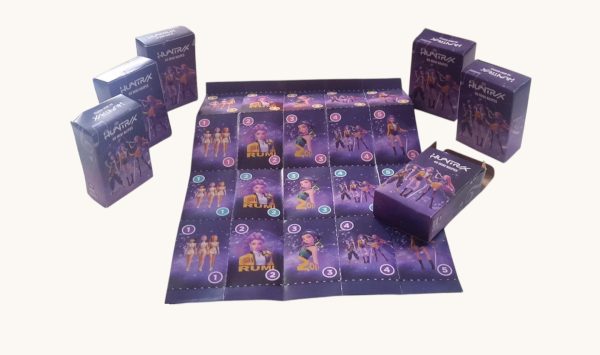 6 cajitas que contienen mini naipes estampados de los personajes de kpop hunter.